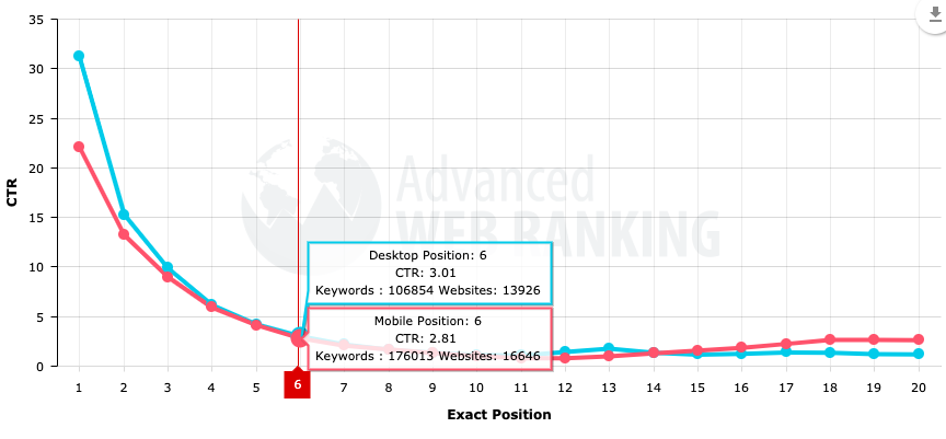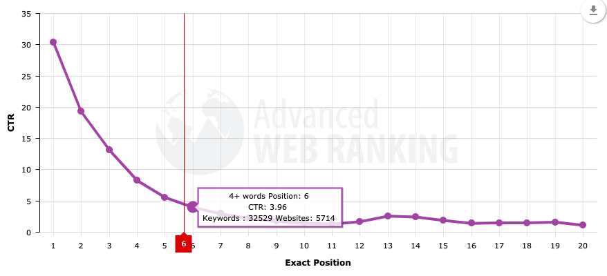 6. The first position on SERP collects around 30% of the clicks. Second gets 15%; third gets 10%. By the time you get to the ninth and tenth positions, click-through-rates have fallen to about 2%.