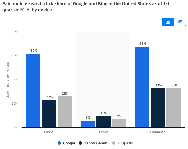 1. When it comes to paid mobile search click sharing, Bing and Yahoo aren’t as far behind Google as in (every) other area. 33% of all paid mobile search clicks come through Bing or Yahoo.