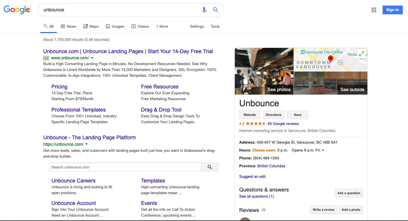 For example, if you Google “Unbounce,” their paid search ad (plus their organic result) means they control everything above the fold: